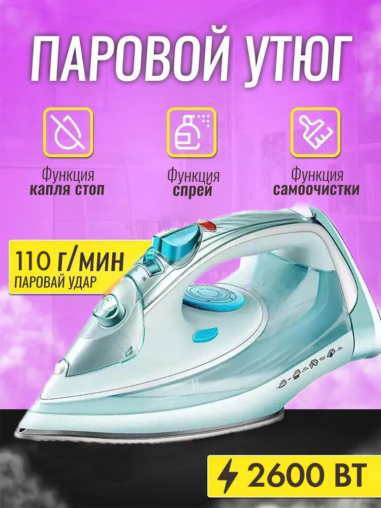 Домашний утюг паровой, с функцией вертикальной глажки, паровой удар, антипригарное покрытие, система самоочистки, 2600ВТ