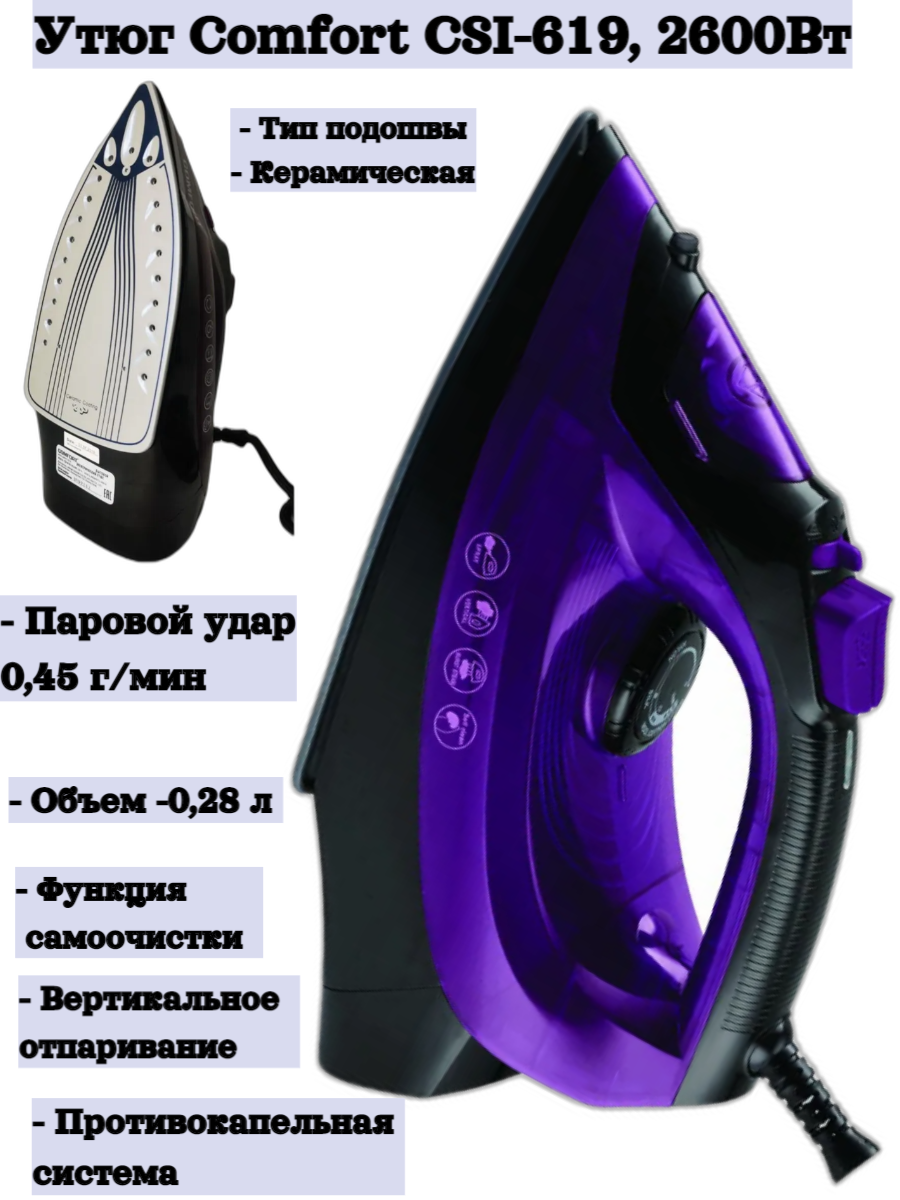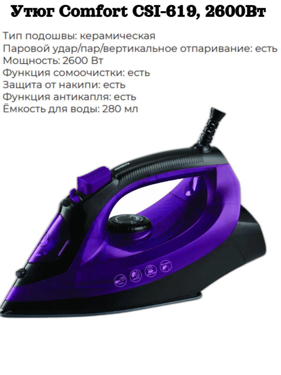 Утюг с отпаривателем Comfort CSI-619, 2600Вт, керамическая подошва, высокая мощность, 280 мл информация: