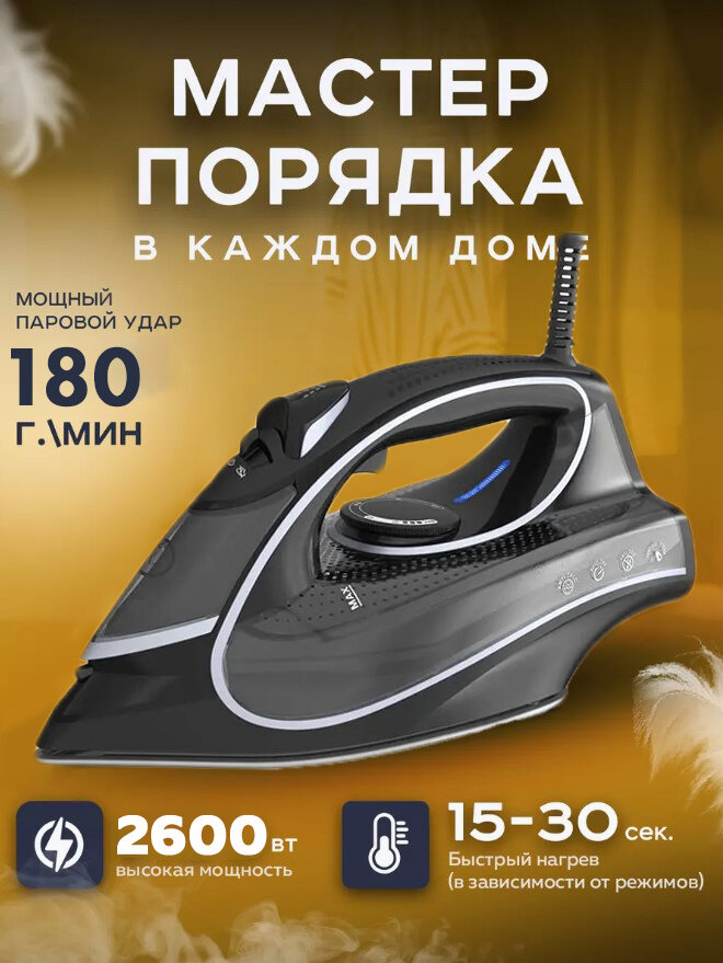 Домашний утюг паровой, с функцией вертикальной глажки, паровой удар, антипригарное покрытие, система самоочистки, 2600ВТ