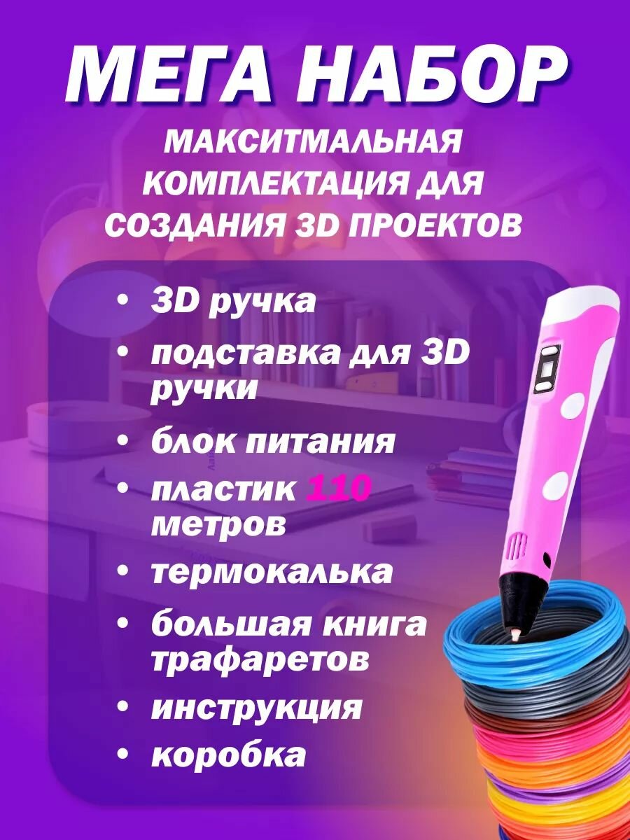 3D-PEN BIG MIX,3Д ручка фиолетовая с набором дополнительного пластика 100м и трафаретами. набор для творчества. с дисплеем. для девочек и мальчиков