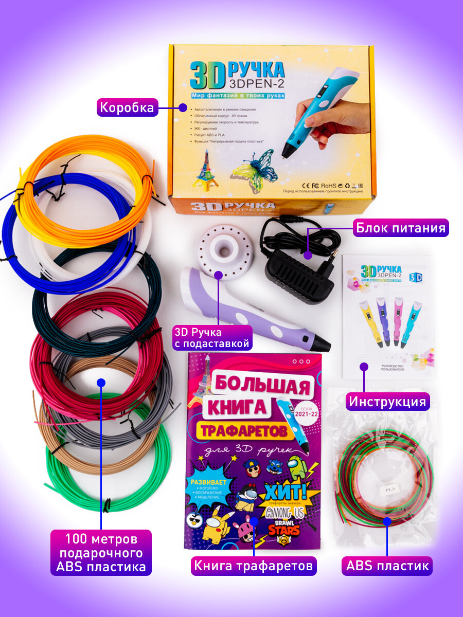 10 цен на 3D ручка 3D BABY PEN-3 фиолетовая\Мир фантазий в твоих руках с трафаретами фиолетовая 100 метров пластика В подарок!
