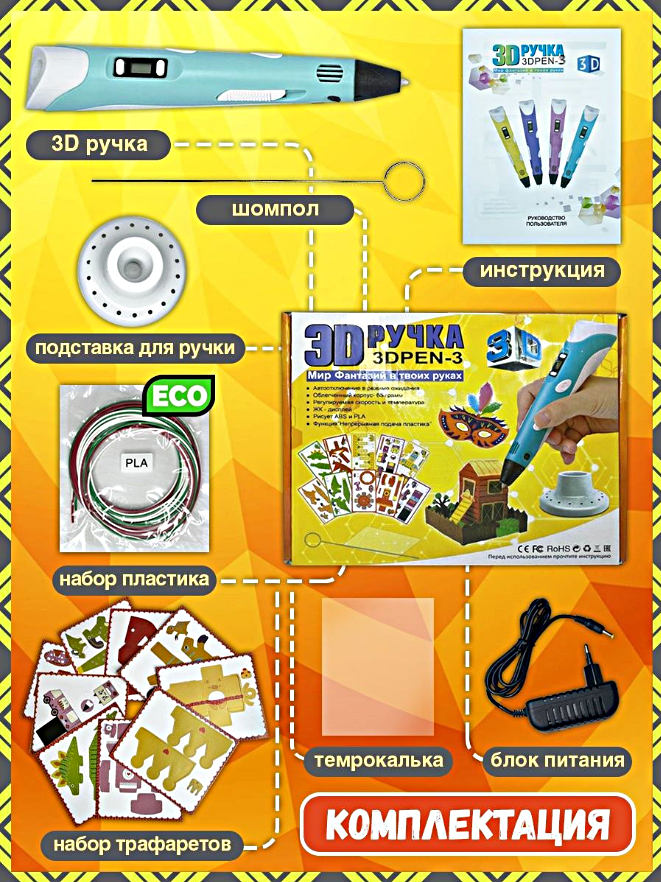 | Комплектация | 1 Руководство пользователя; Подставка для 3Д Ручки -1шт; 1 адаптер питания; трафарет; 3д ручка, шомпол, пластик PLA |