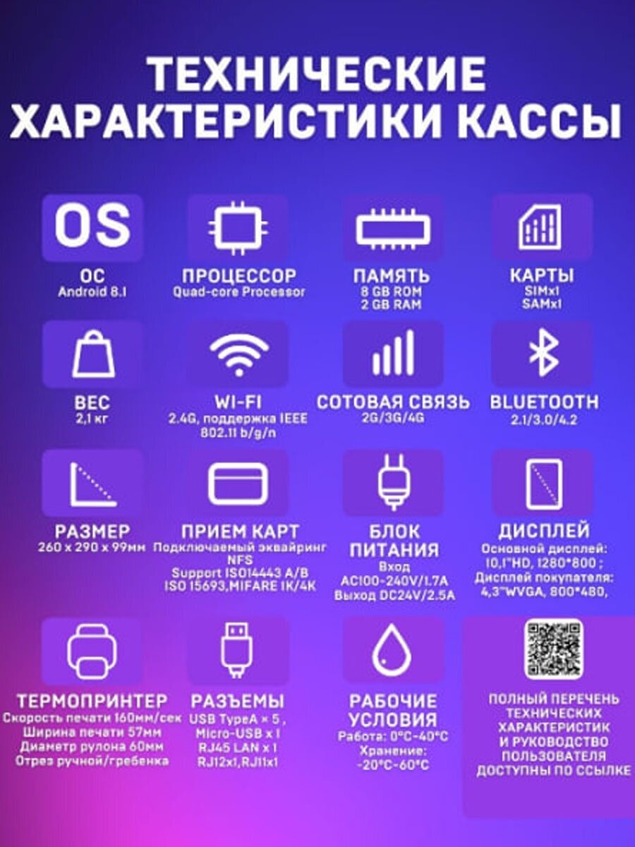 | Особенности | встроенный принтер чеков / встроенный сканер штрих кода / подключение банковского терминала |