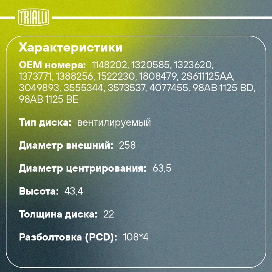 Диск тормозной высокоуглеродистый с технической выточкой и окраской передний правый для автомобилей Ford Fiesta (01-) d=258 4*108 (серия Carville Racing) CRB 1018 TRIALLI информация: