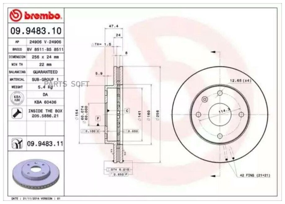 09.9483.11 диск тормозной передний с покрытием Daewoo Nubira, Chevrolet Lacetti 1.4-1.8 03] (упаковка 2 шт.), Brembo 09948311 11 422 ₽