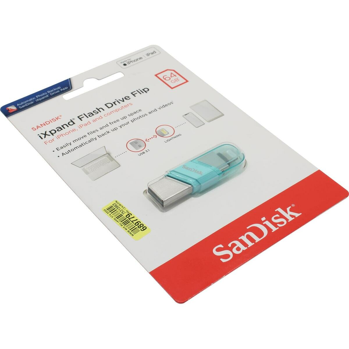 SanDisk 64Gb iXpand Flash Drive Flip USB3.0, бирюзовый SDIX90N-064G-GN6NK, 1шт. 2 510 ₽