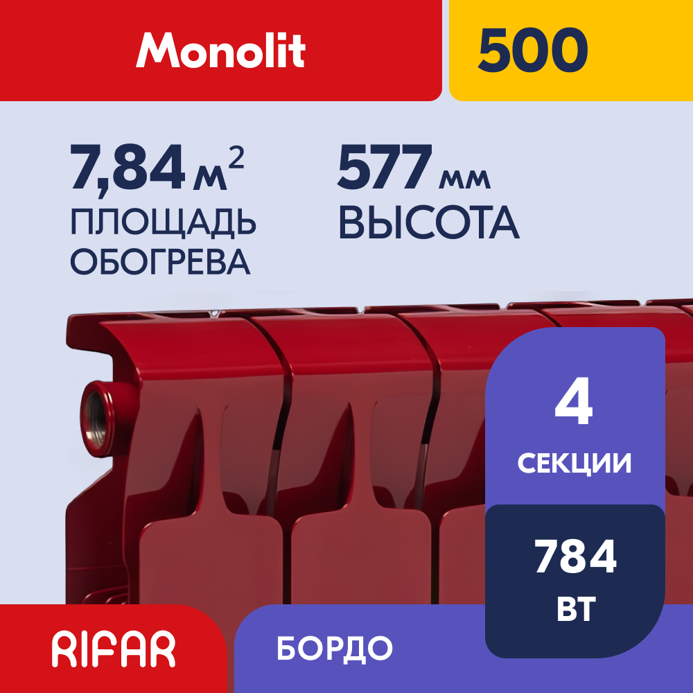 10 цен на Rifar Monolit 500 - 4 секции, цвет Бордо (RAL 3011 красный) боковое подключение