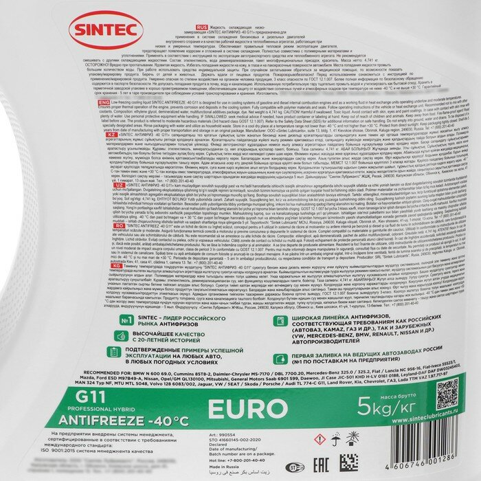 Антифриз SINTEC EURO G11 (-40) 5 л, 1 уп. 1 941 ₽