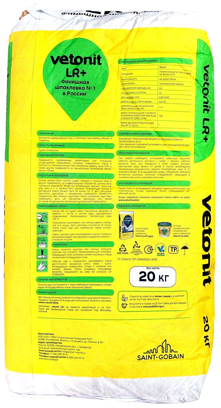 Шпаклевка (шпатлевка) Вебер Ветонит LR+ финишная полимерная белая для сухих помещений 1-5 мм 20 кг информация:
