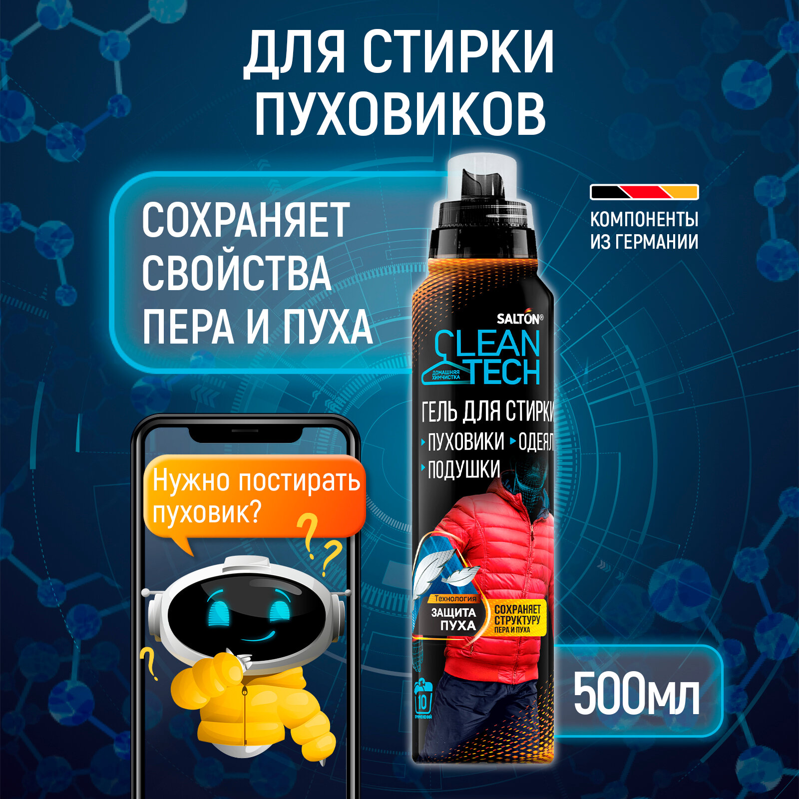Гель для стирки Salton CleanTech пуховиков, курток, одеял, подушек, изделий из синтепона и пера, 500 мл