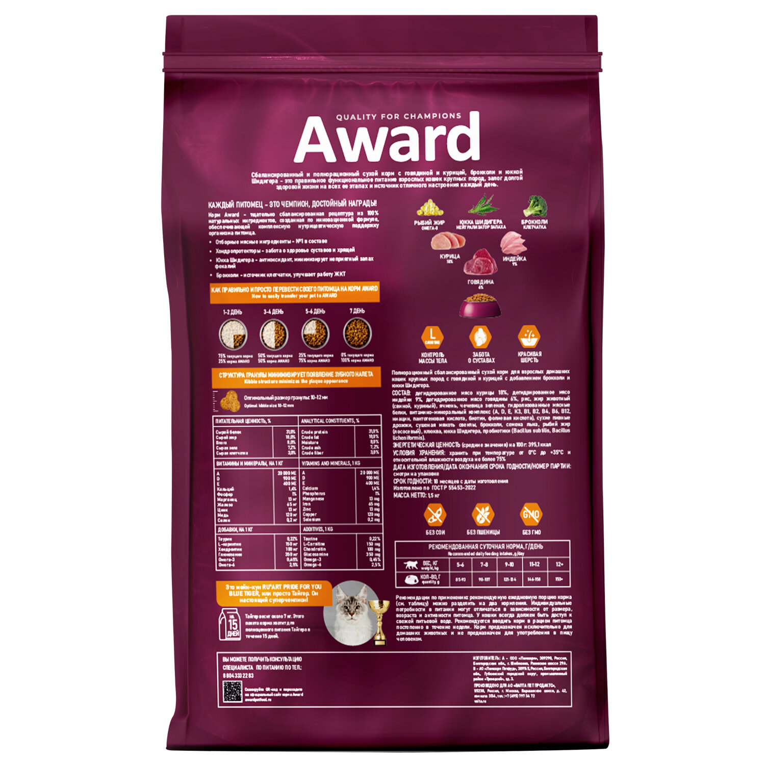 Сухой корм AWARD Indoor Big cats для взрослых домашних кошек крупных пород с говядиной и курицей с добавлением брокколи и юкки Шидигера 1,5кг информация: