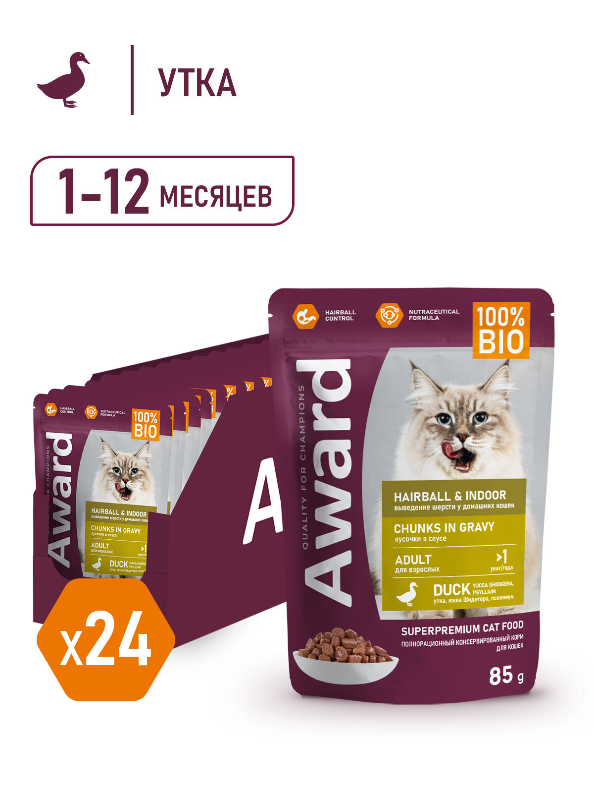 Влажный корм AWARD Hairball & Indoor для выведения шерсти у взрослых домашних кошек кусочки в соусе с уткой 85г информация: