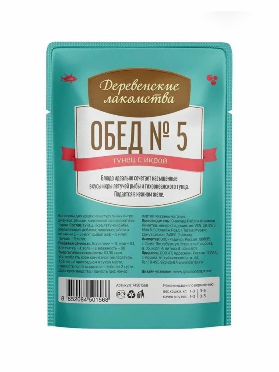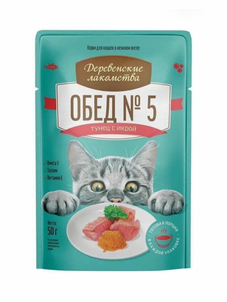 Влажный корм для кошек "Деревенские лакомства обед №5" тунец с икрой 50гр.*12шт. информация: