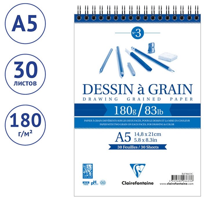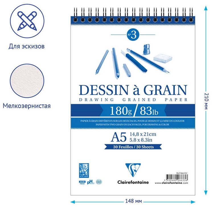 Скетчбук 30л., А5 Clairefontaine Dessin a grain, на гребне, 180г/м2, мелкозернистая ( Артикул 320104 ) 842 ₽