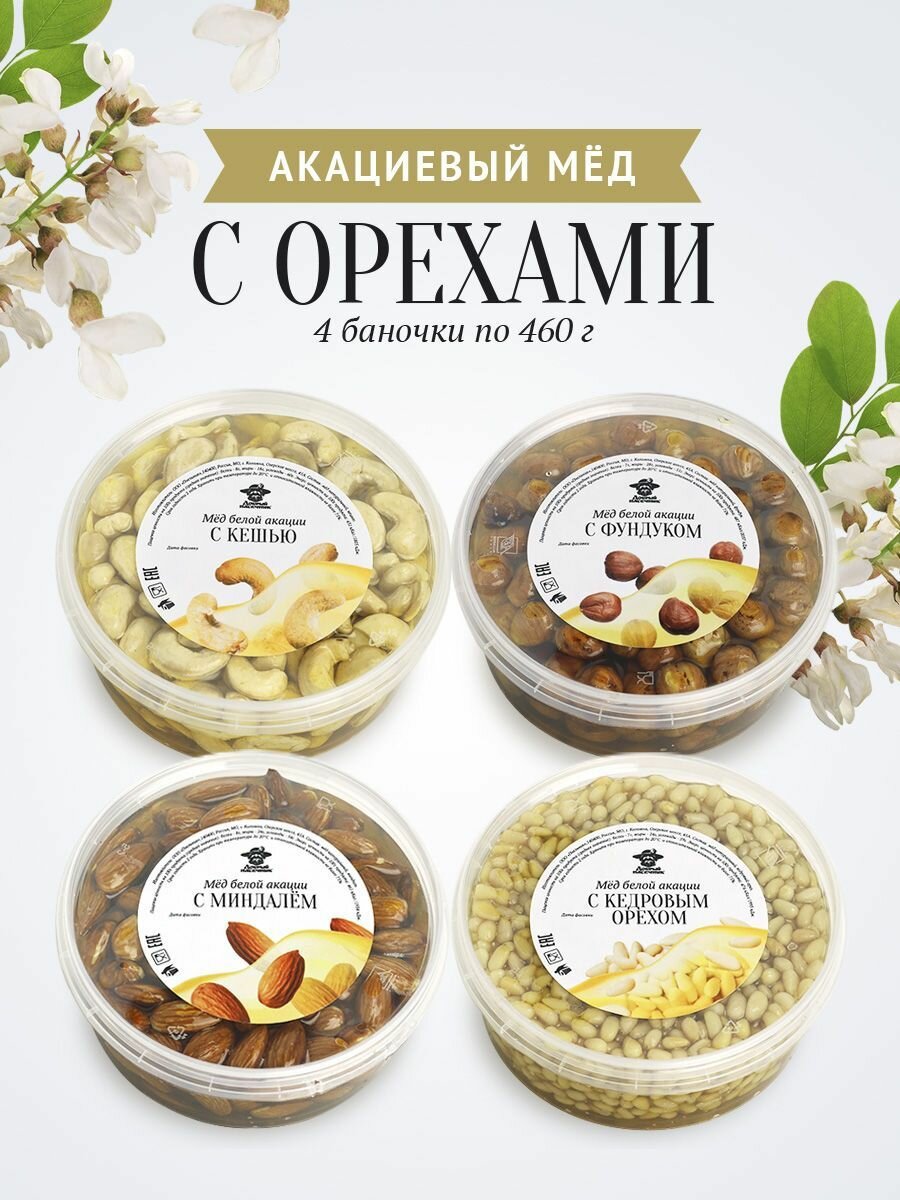 10 цен на Набор акациевого меда с орехами ассорти, 4 банки по 460 г
