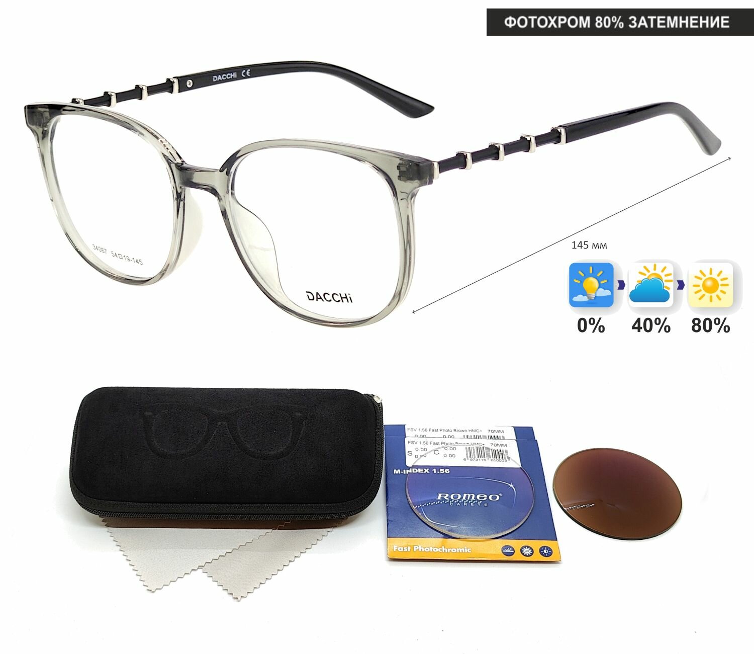 Фотохромные очки с футляром-змейка DACCHI мод. 34067 Цвет 3 с линзами ROMEO 1.56 FAST Photocolor BROWN, HMC+ -1.00 РЦ 64-66 информация: