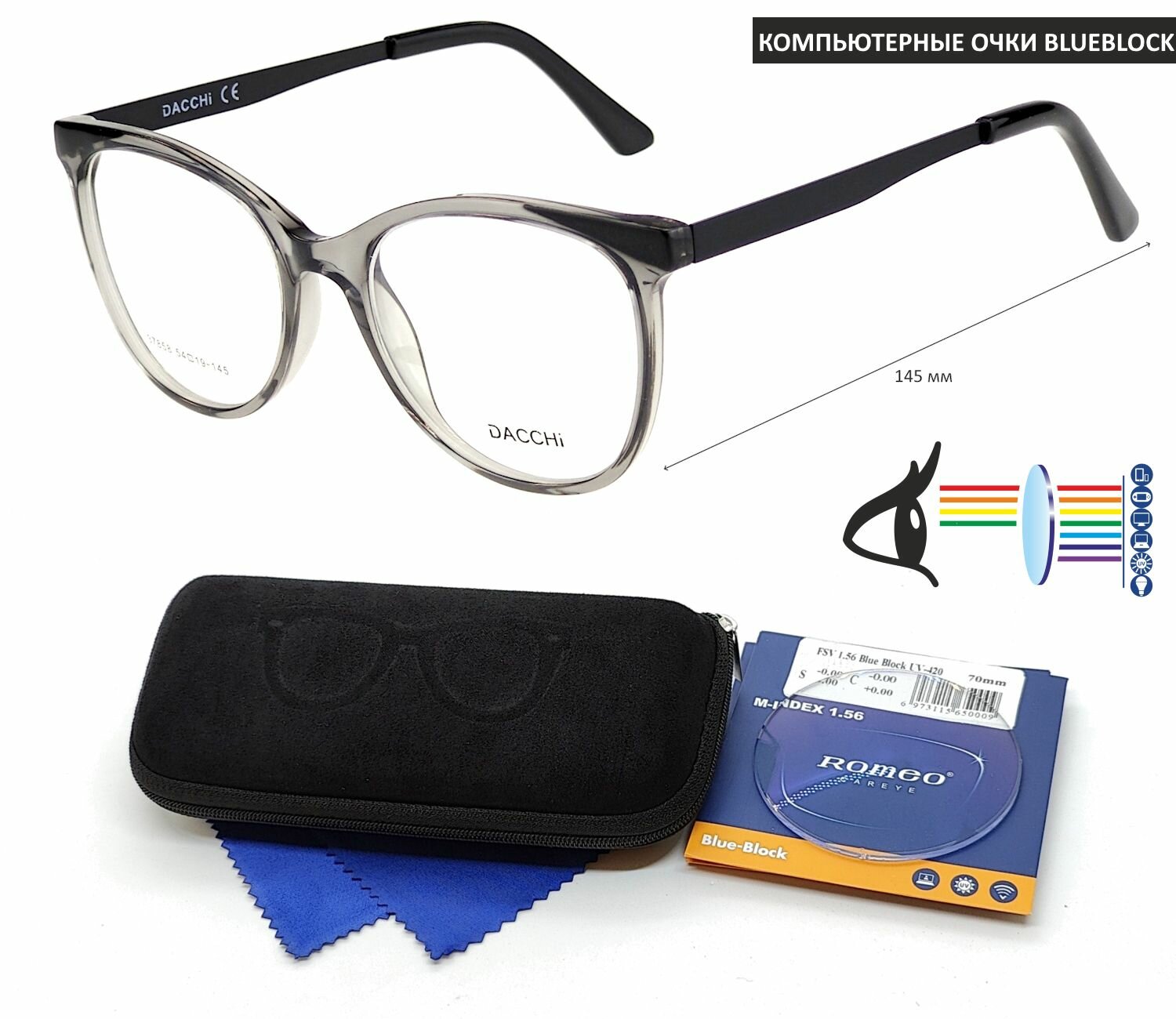 Компьютерные очки для чтения с футляром-змейка DACCHI мод. 37858 Цвет 4 с линзами ROMEO 1.56 Blue Block +2.25 РЦ 62-64 информация:
