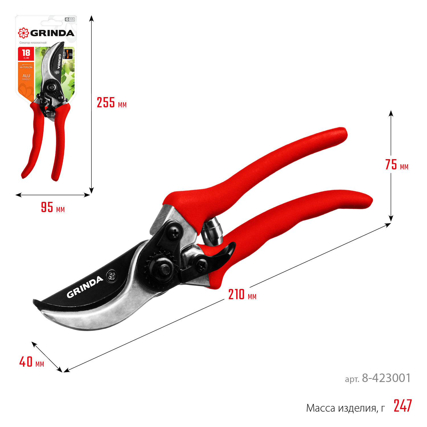 GRINDA G-11, 210 мм, лезвия из углеродистой стали, закалены, тефлоновое покрытие, алюминиевые рукоятки, плоскостной секатор (8-423001)