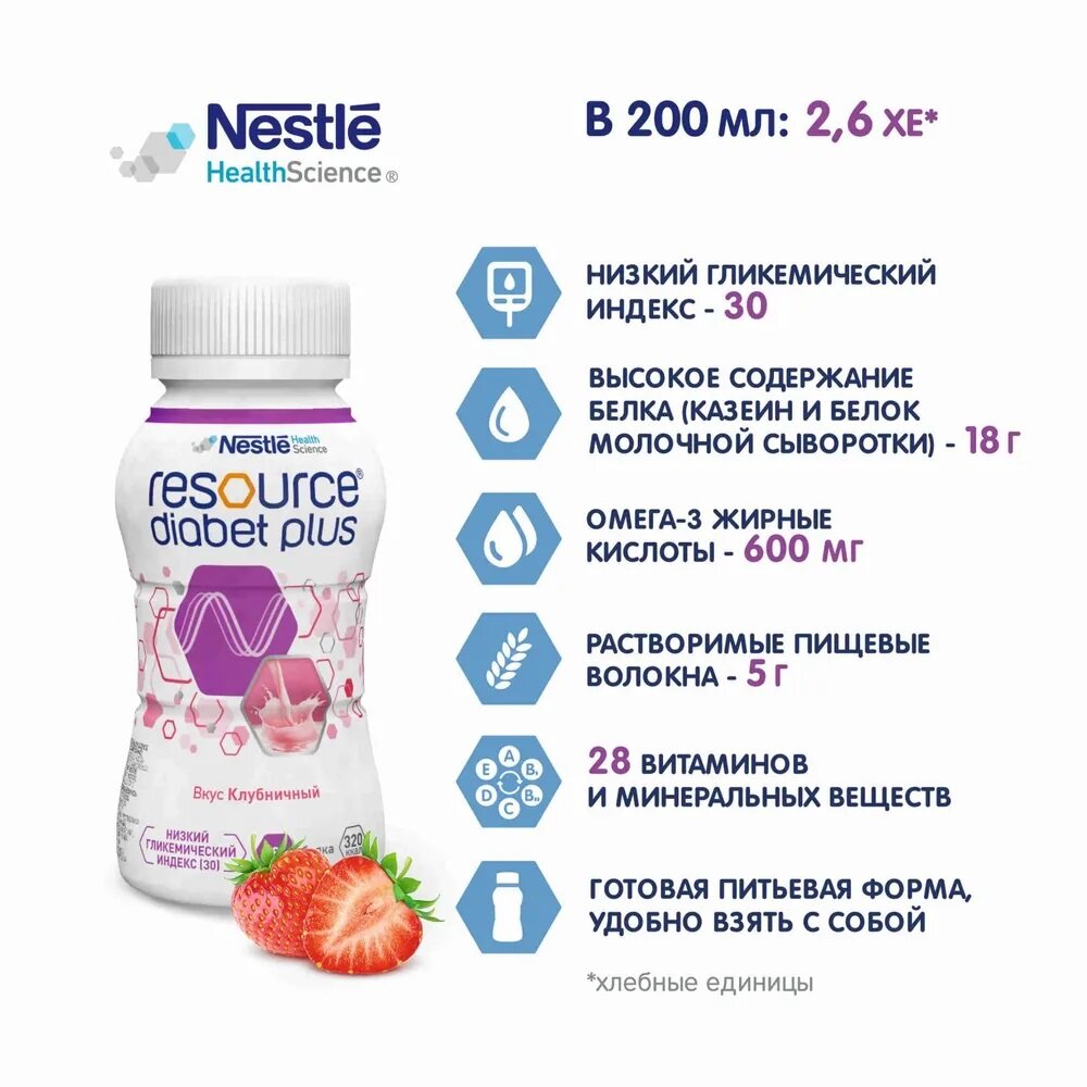 Nestle Resource Diabet Plus / Ресурс Диабет Плюс, высокобелковая молочная смесь со вкусом клубники, 200 мл х №4 информация: