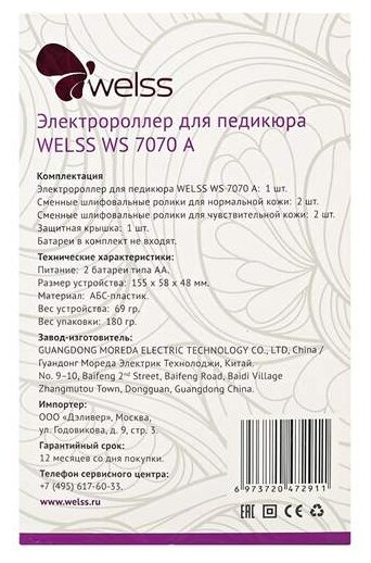 Электрическая роликовая пилка для педикюра Welss WS 7070 А, 2400 об/мин, белый/фиолетовый информация: