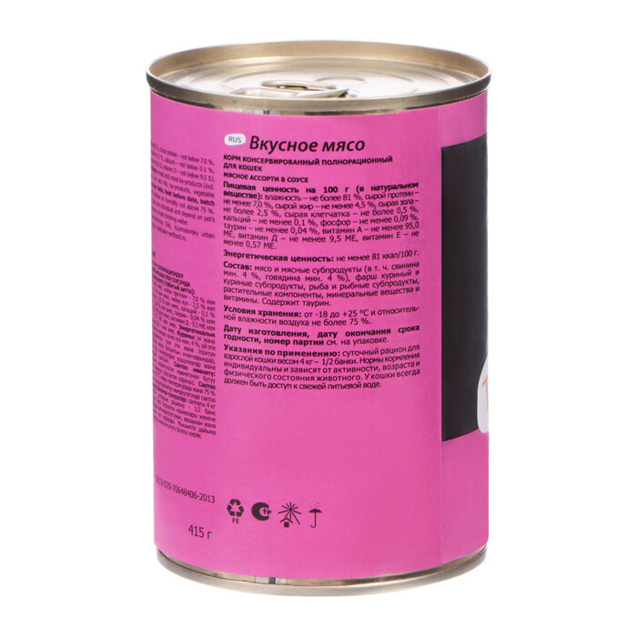Влажный корм TASTY для кошек мясное ассорти в соусе 415г информация: