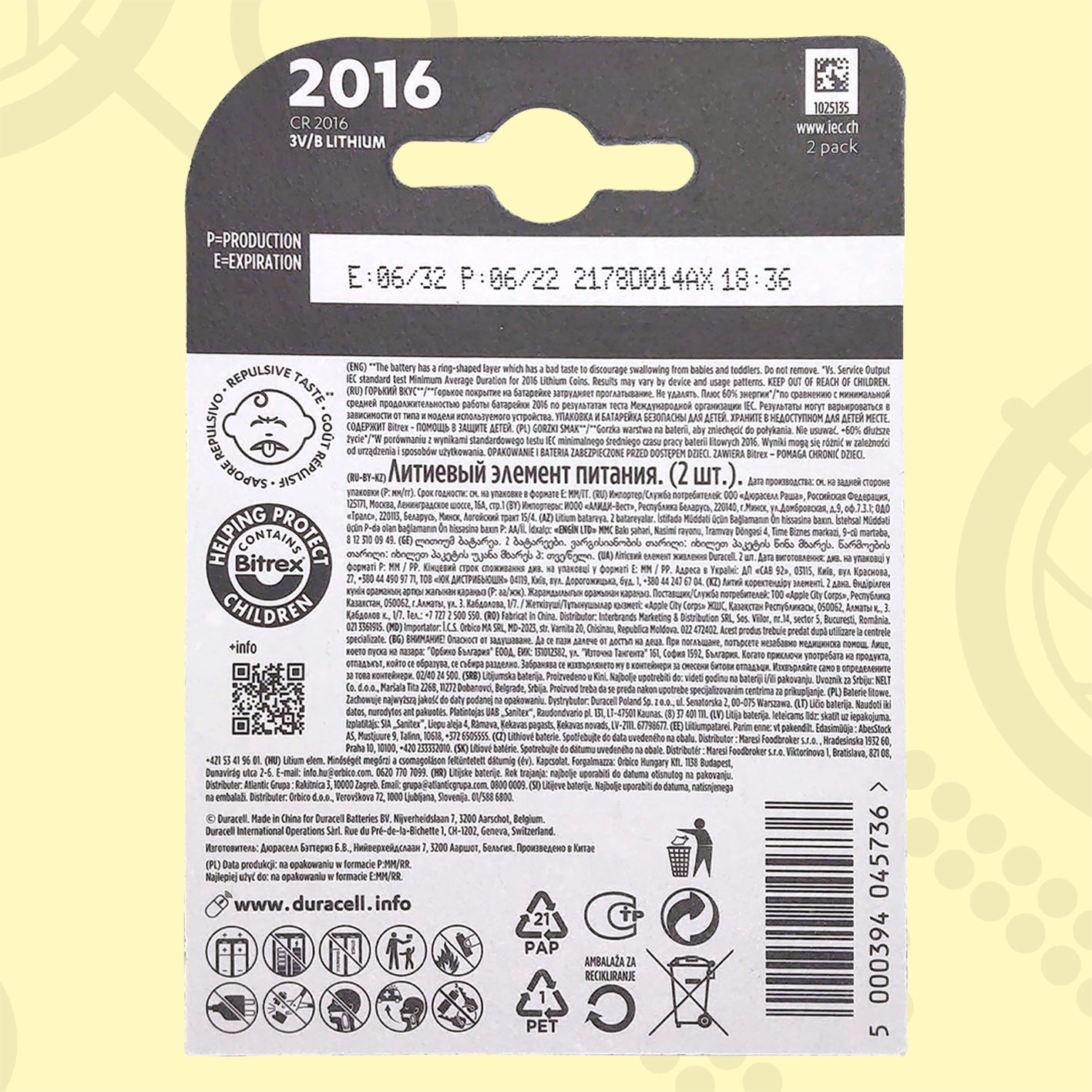 Duracell 2016 (CR2016) Extra Life | 3 Вольта Литиевая батарейка - 6шт. информация: