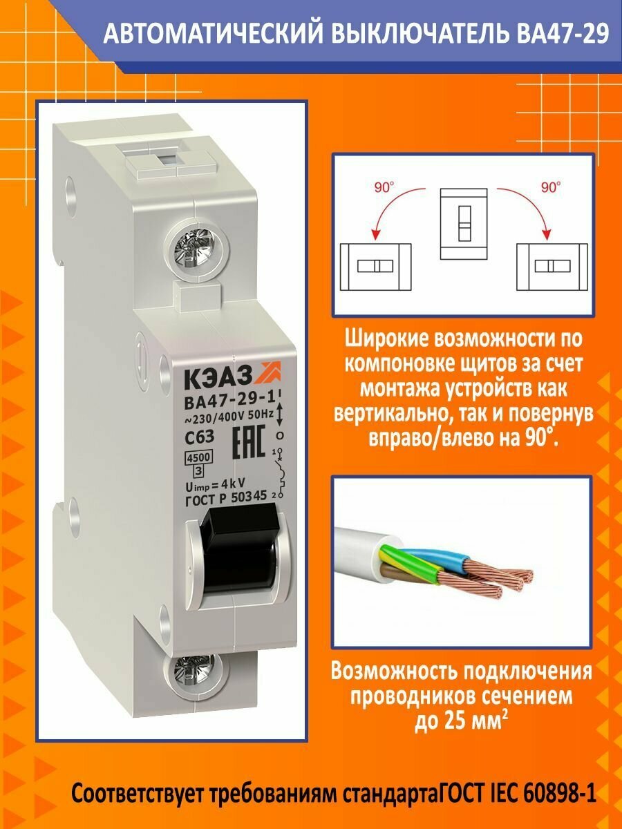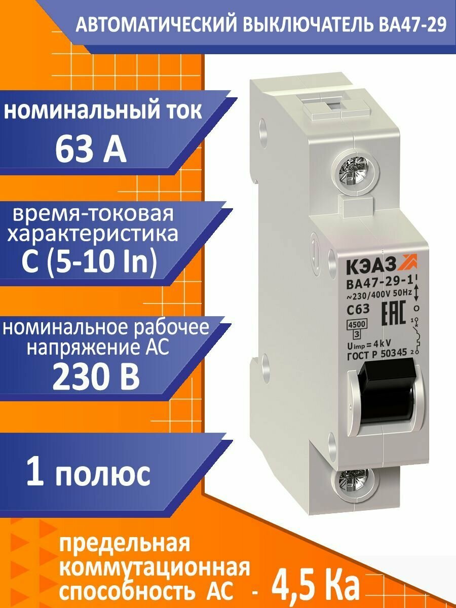 КЭАЗ ВА47-29 Автоматический выключатель 1P 63A C 4,5кА AC(ВА47-29-1C63-УХЛ3), КЭАЗ, арт.141590 информация: