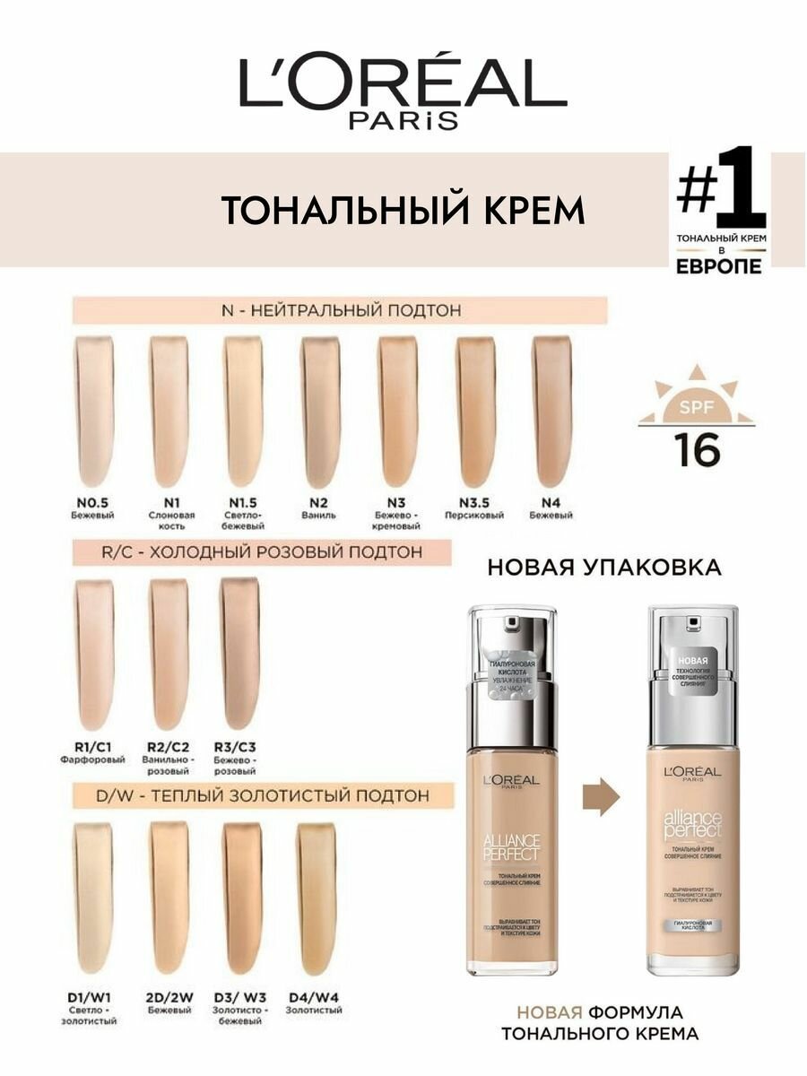 L'Oreal Paris, Тональный крем ALLIANCE PERFECT совершенное слияние обогащенный гиалуроновой кислотой, тон 1.D / 1.W, SPF 16, 30 мл 1 106 ₽