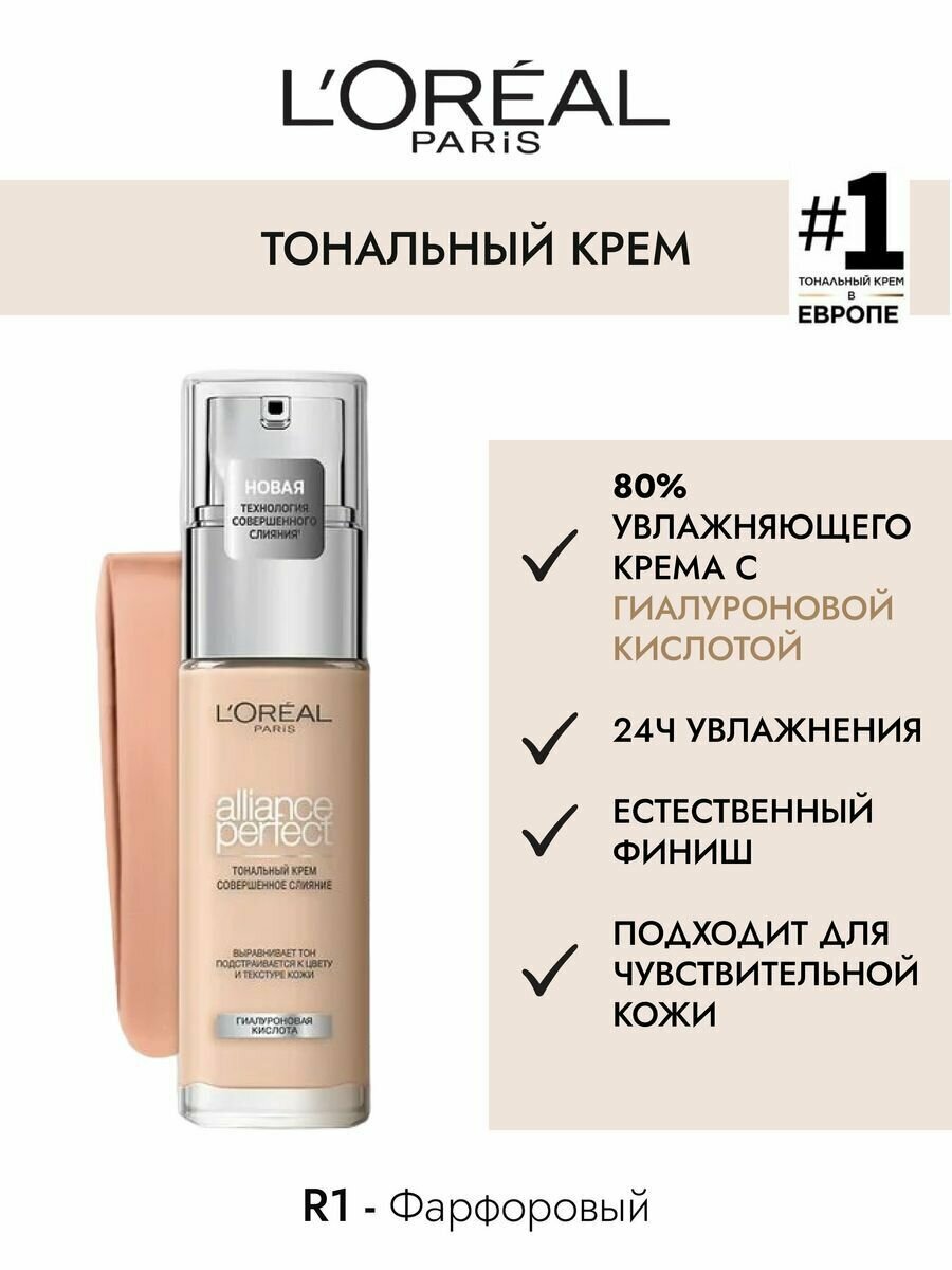 L'Oreal Тональный крем "Alliance Perfect, Совершенное слияние", выравнивающий и увлажняющий, оттенок 1R, фарфоровый, 30 мл 622 ₽