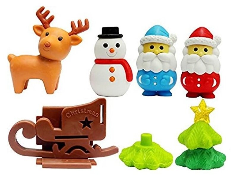Отзывы на IWAKO набор Ластиков рождество. 6 разборных предметов: два Деда мороза, Снеговик, Олень, Сани, Ёлка. Блистер подарочный