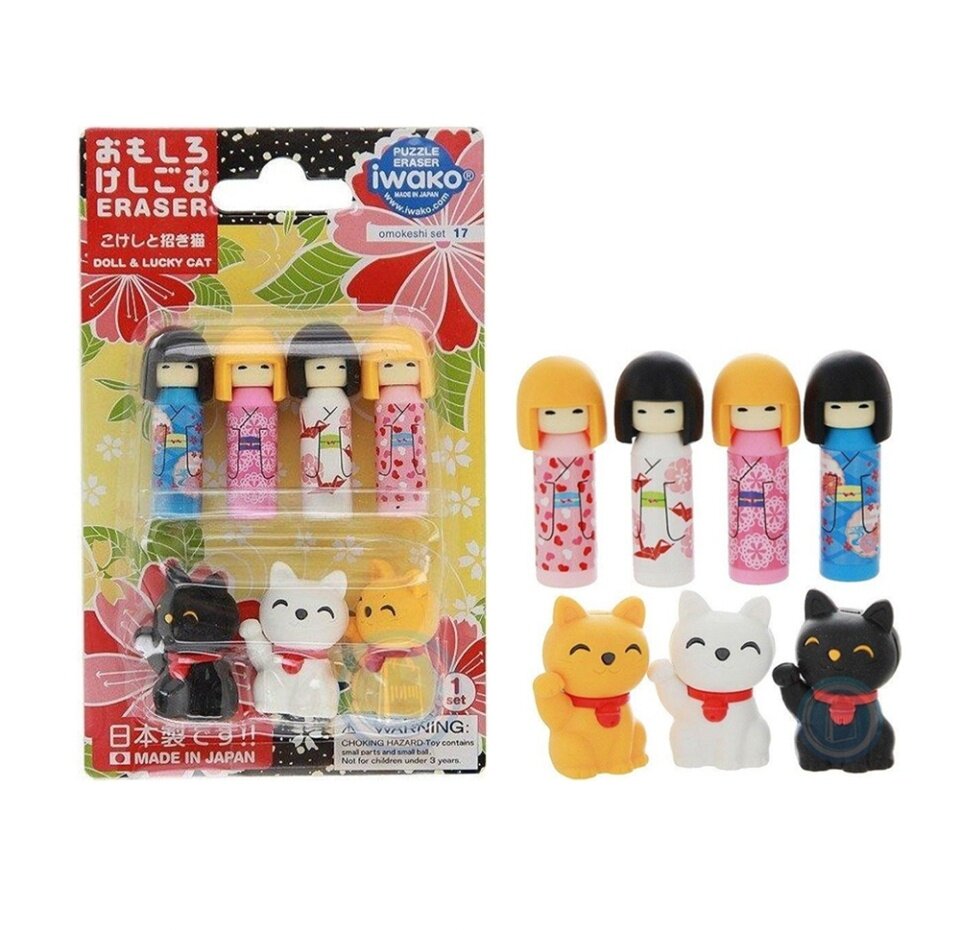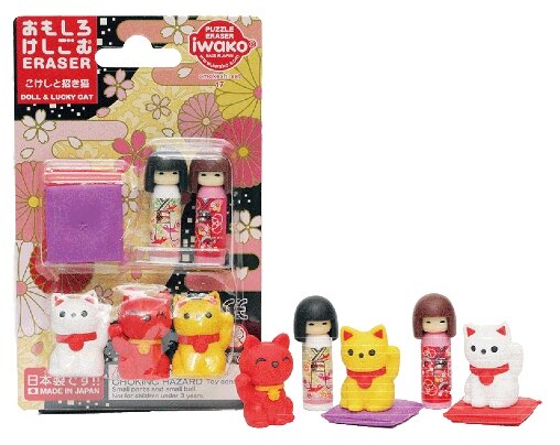 Отзывы на IWAKO набор Ластиков удача, деньги. 7 разборных предметов: Две Куклы Кокеши, Три Кошки Менеки Неко, Две циновки. Блистер подарочный