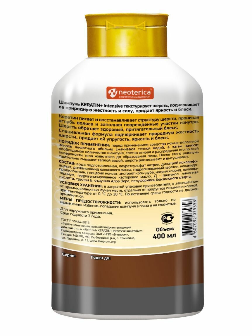Шампунь для жесткошерстных кошек и собак, RolfClub KERATIN+ Intensive, 400мл