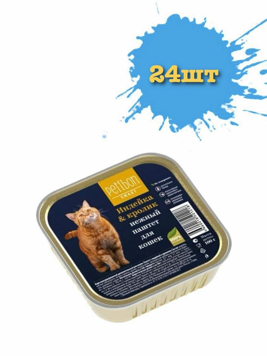 Корм консервированный для кошек Petibon "Smart Паштет", с индейкой и кроликом, упаковка 24 шт х 100 г
