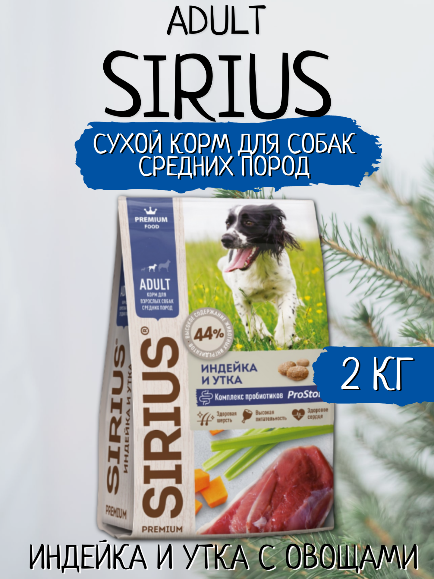 Сухой корм сириус SIRIUS PREMIUM для взрослых собак средних пород, индейка и утка с овощами, 2 кг