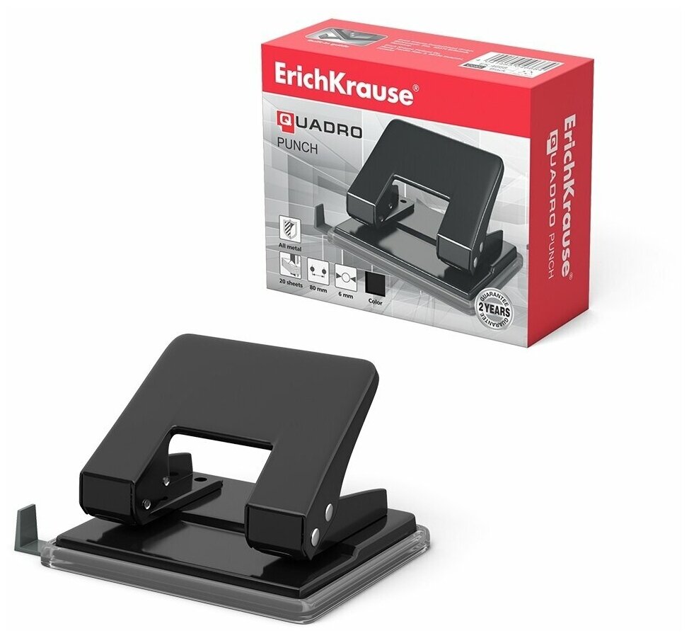 Дырокол ErichKrause Quadro, до 20 листов, диаметр прокола 6 мм, расстояние между проколами 80 мм, черный