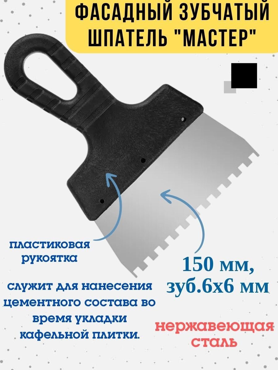Шпатель фасадный Remocolor Шпатель фасадный "Мастер", зубчатый, нерж. сталь 0,4мм, пластик. рукоятка, 150мм, зуб 6х6мм информация: