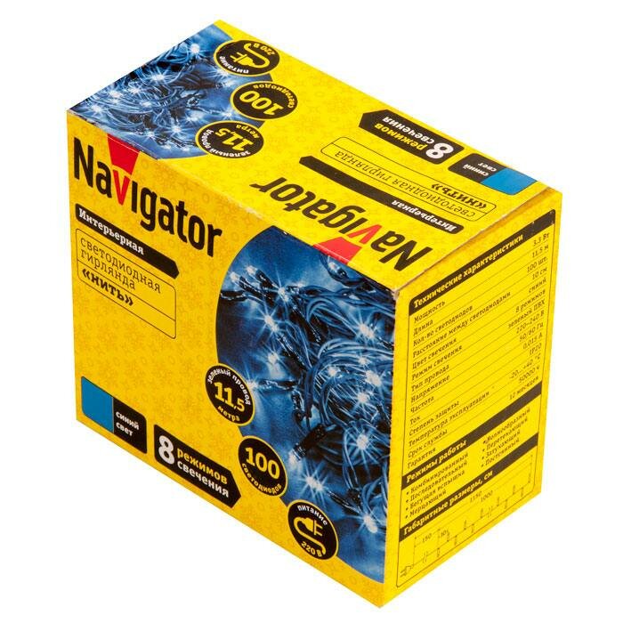 Гирлянда светодиодная Нить Navigator 61 821, 11.5 м, синий свет, зеленый провод, IP20