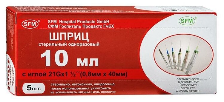 Шприц одноразовый трехкомпонентный SFM 10мл 21G (0.8x40мм, 5 штук в упаковке)