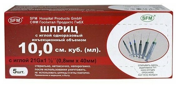 Шприц 3-комп. однораз. 10мл LS 21G(0,8x40) над. 5шт/уп SFM информация: