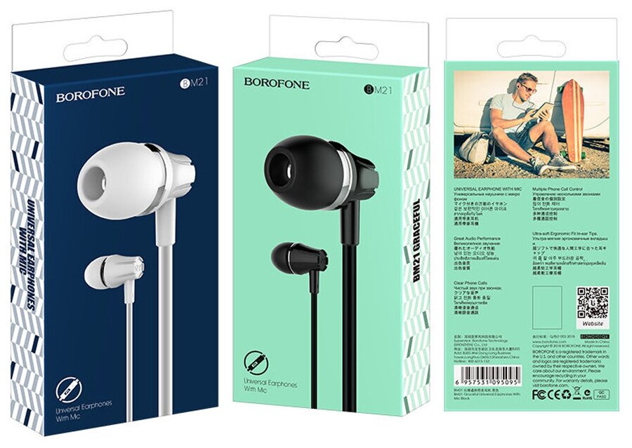 Наушники Borofone M21 Graceful, вакуумные, микрофон, Jack 3.5 мм, кабель 1.2 м, белые
