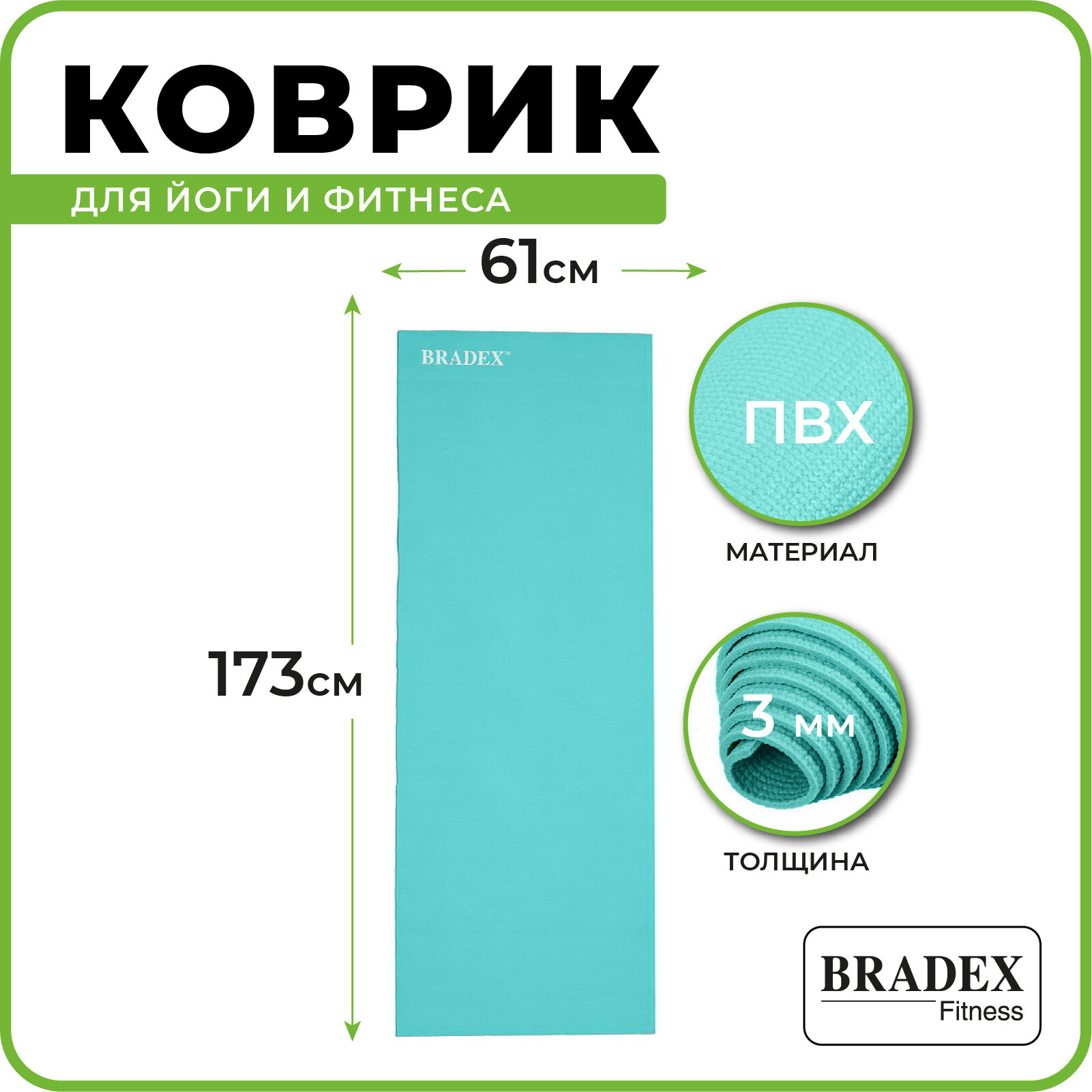 Коврик для йоги и фитнеса 173*61*0,3 бирюзовый Bradex (SF 0400) .