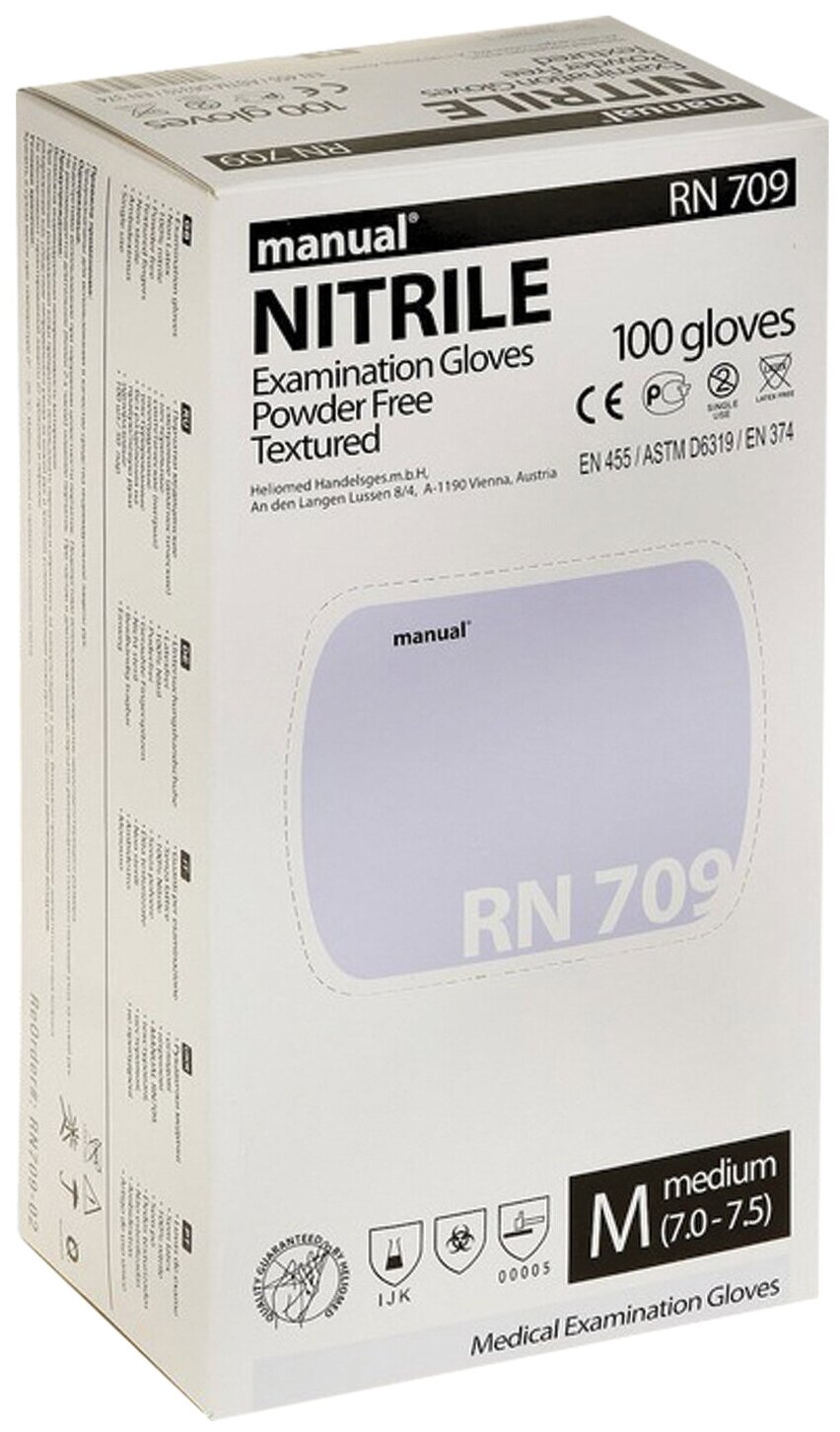 Перчатки одноразовые нитриловые смотровые Manual RN 709, нестерильные, размер M, 50 пар в упаковке