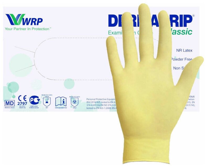 Перчатки латексные смотровые WRP Dermagrip Classic, 50 пар/100 штук, размер: M, цвет: светло-желтый