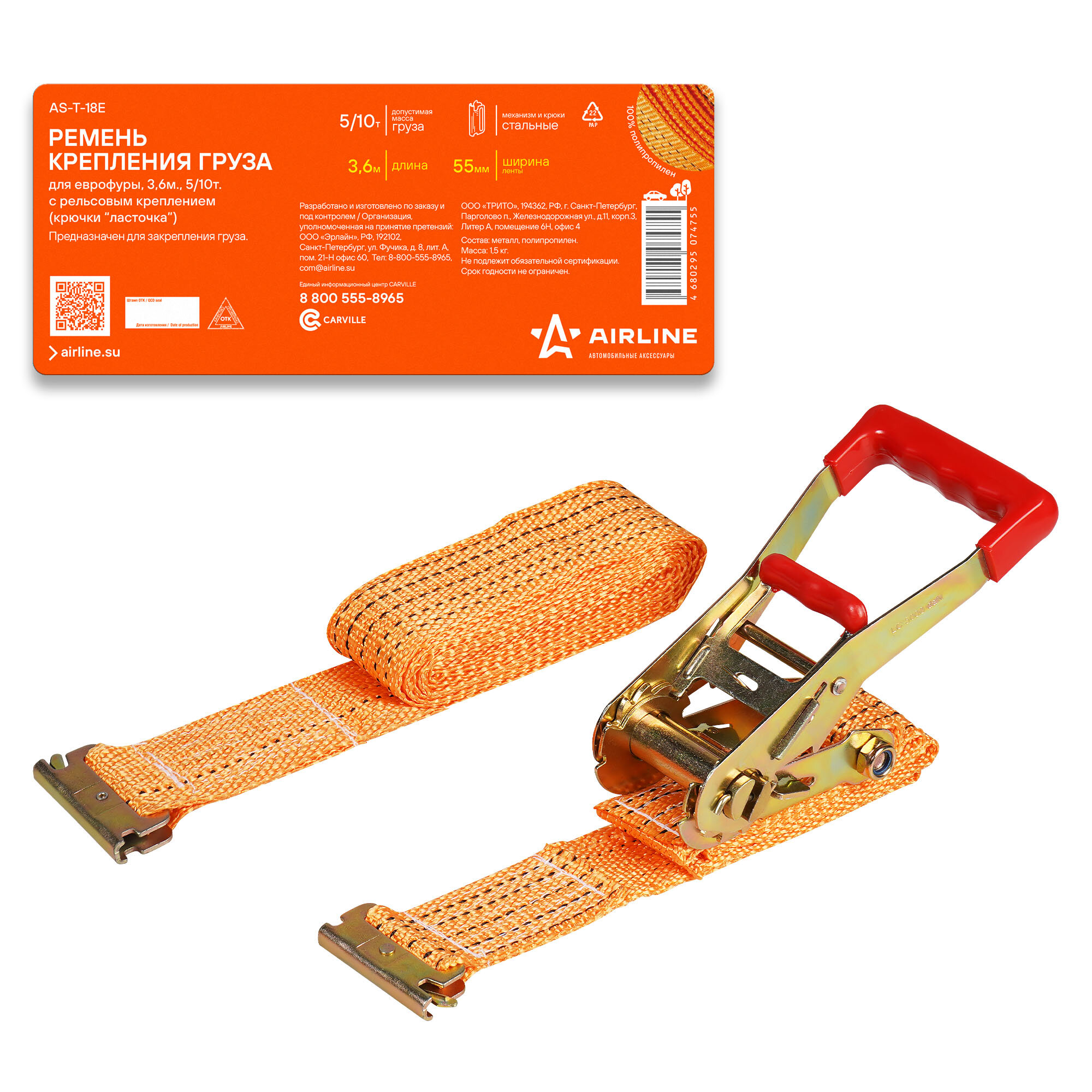 As-T-18e_ремень Крепления Груза! Еврофура 3.6м, 5/10т, Ш.55мм, С Рельс. Крепл., Крючки Ласточка AIRLINE арт. AST18E