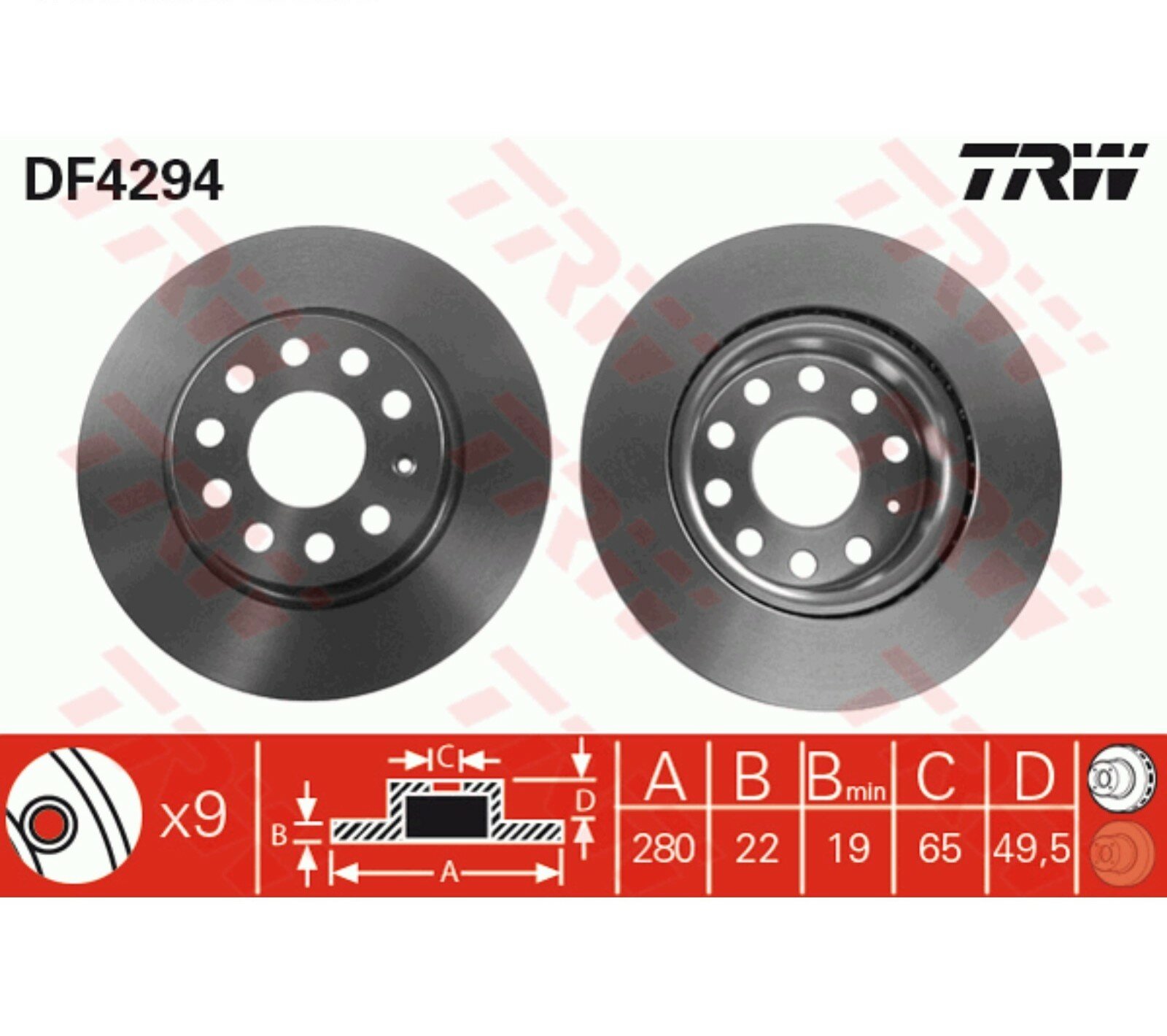 Диск тормозной передн AUDI: A3 03-, A3 SPORTBACK 04-, SEAT: ALTEA 04-, LEON 99-, LEON 05-, TOLEDO III 04-, SKODA: OCTAVIA 04-, OCTAVIA COMBI 04-, (упаковка 2 шт.), TRW DF4294
