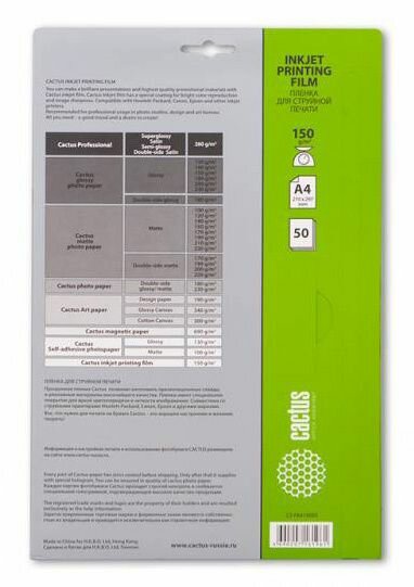 10 цен на Пленка Cactus A4/150г/м2/50л./прозрачный для струйной печати