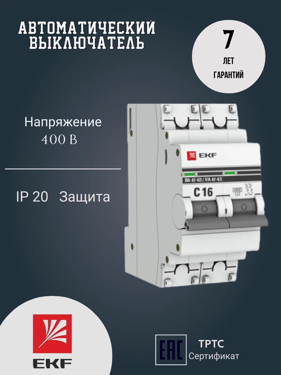 10 цен на mcb4763-2-16C-pro Автоматический выключатель 2P 16А (C) 4,5kA ВА 47-63 EKF PROxima