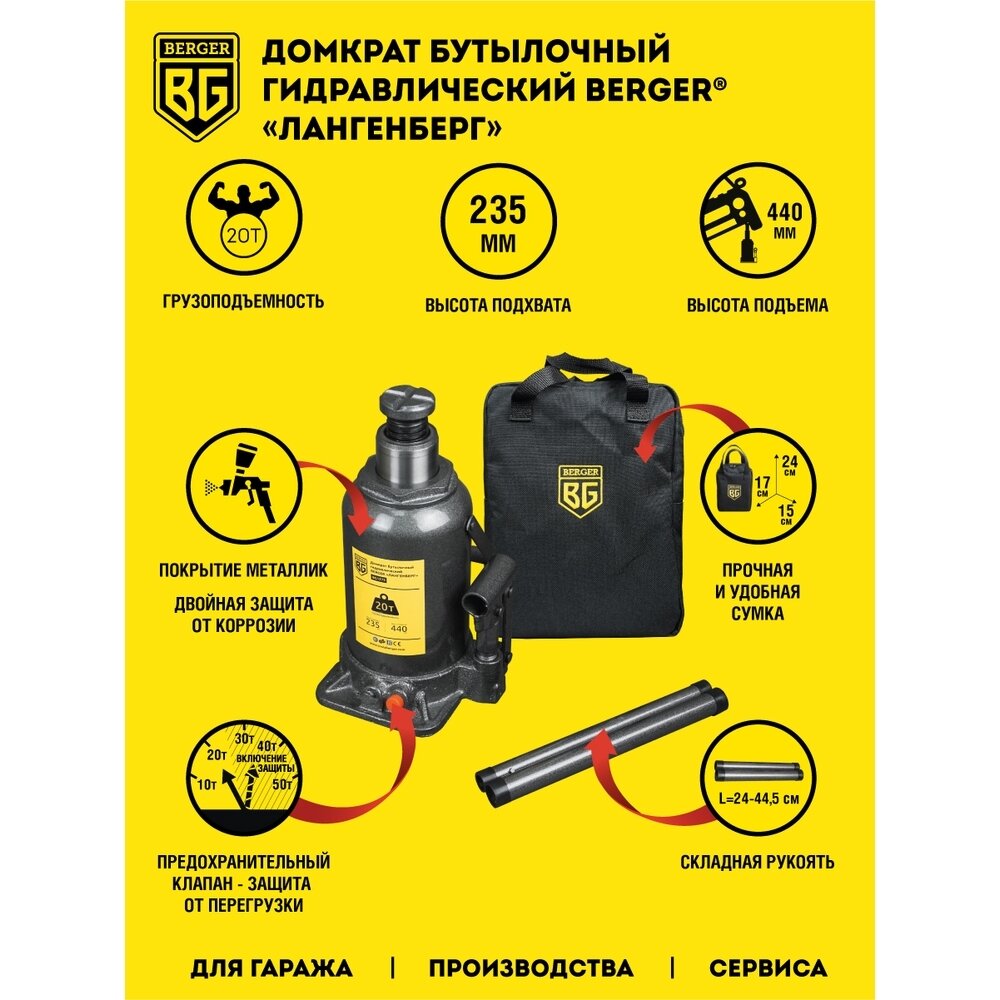 Домкрат бутылочный гидравлический 20т. Лангенберг BERGER BG1273 информация: