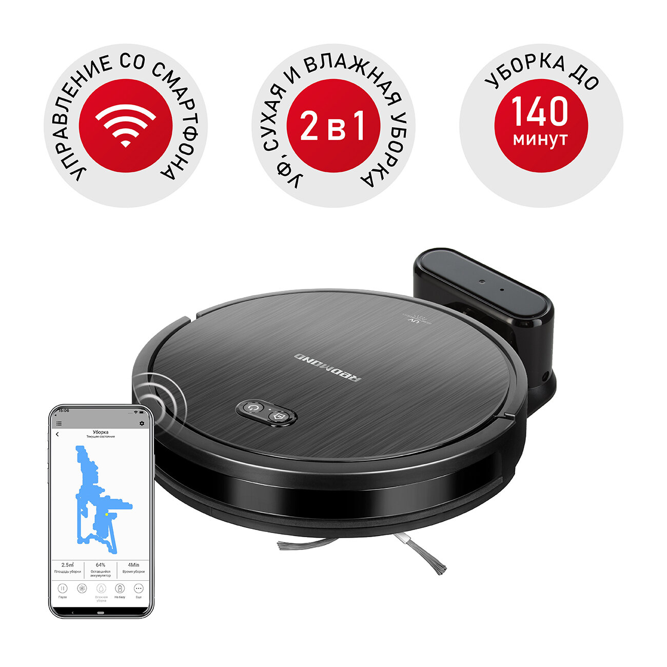 УФ обработка пола, сухая и влажная уборка, управление с пульта и с телефона, хорошая мощность всасывания.