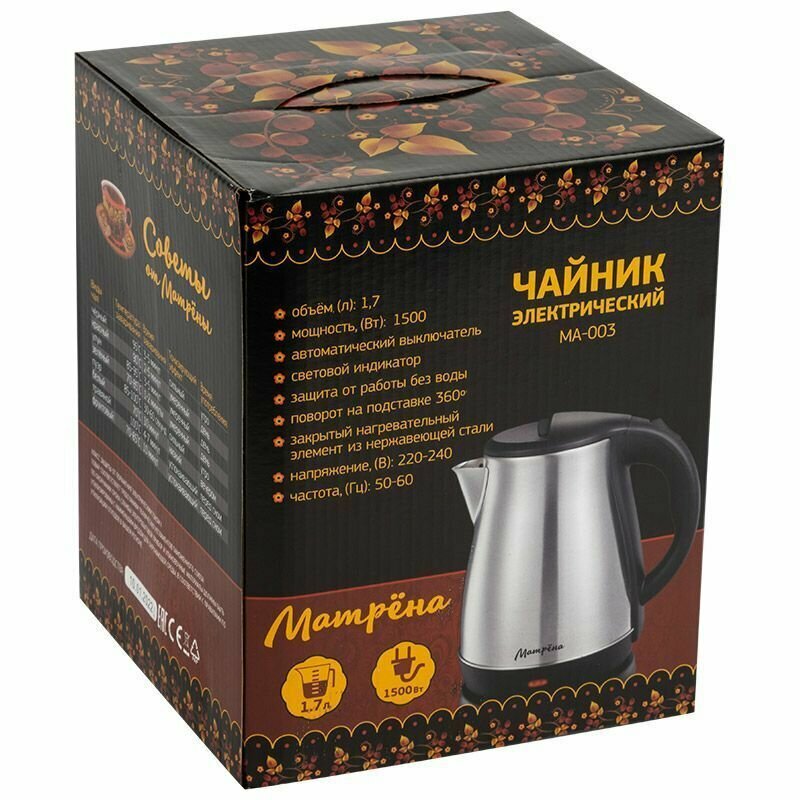 Матрёна Чайник электрический "Матрёна" MA-003, металл, 1.7 л, 1500 Вт, серебристый информация: